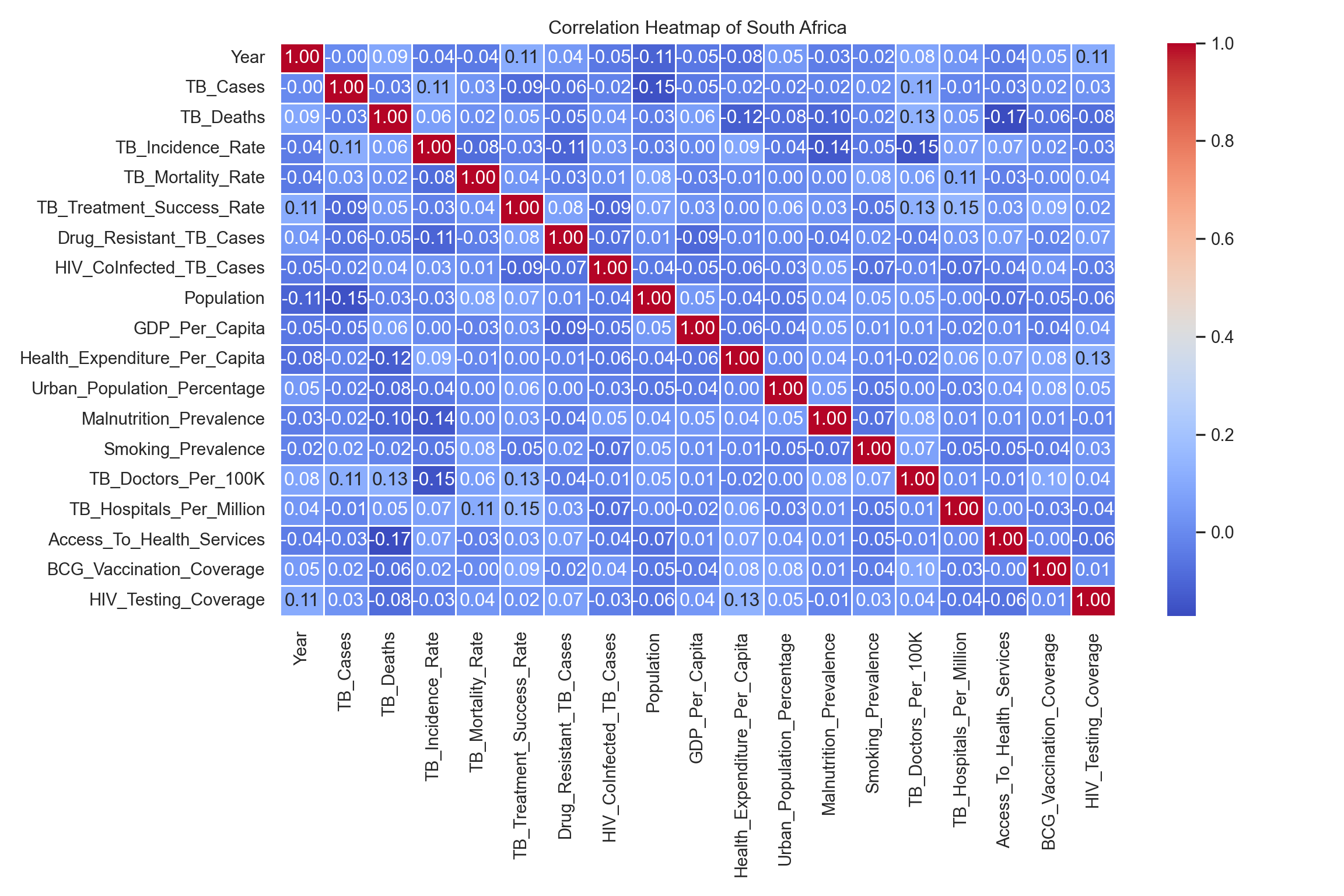 The strongest correlation observed in South Africa is the negative relationship between Access_To_Health_Services and TB_Deaths. This insight is a key takeaway: increasing access to care is potentially the single most impactful structural intervention for reducing TB mortality, which can directly inform policy and resource allocation.
