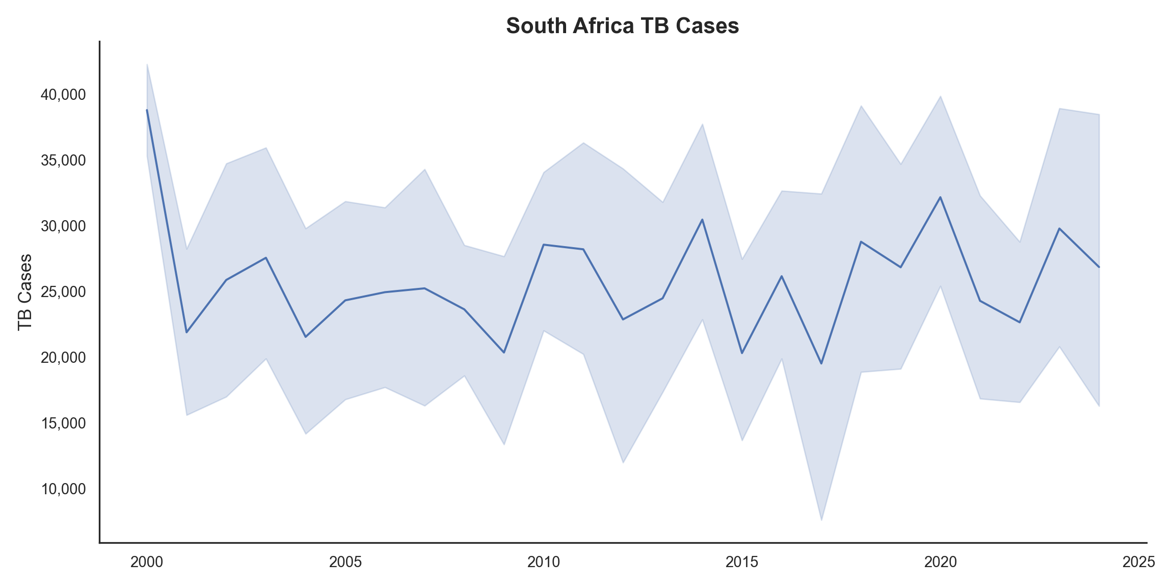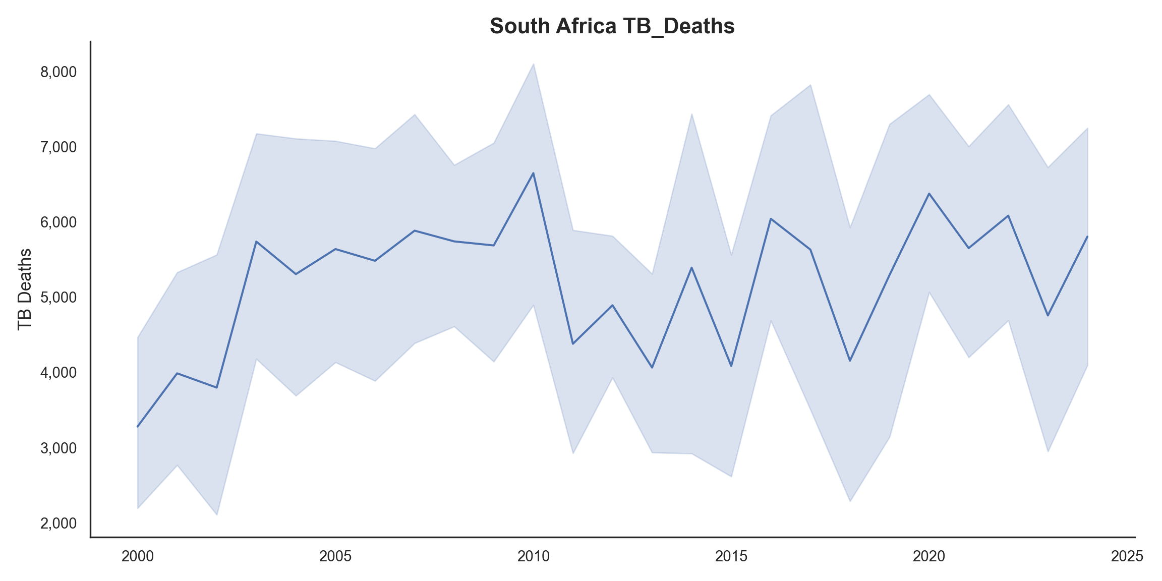 Figure 2 and Figure 3 provide a granular view of South Africa. While TB cases have fluctuated, there is a general trend of decreasing TB deaths since the early 2000s, indicating potential improvements in treatment efficacy or access to care.