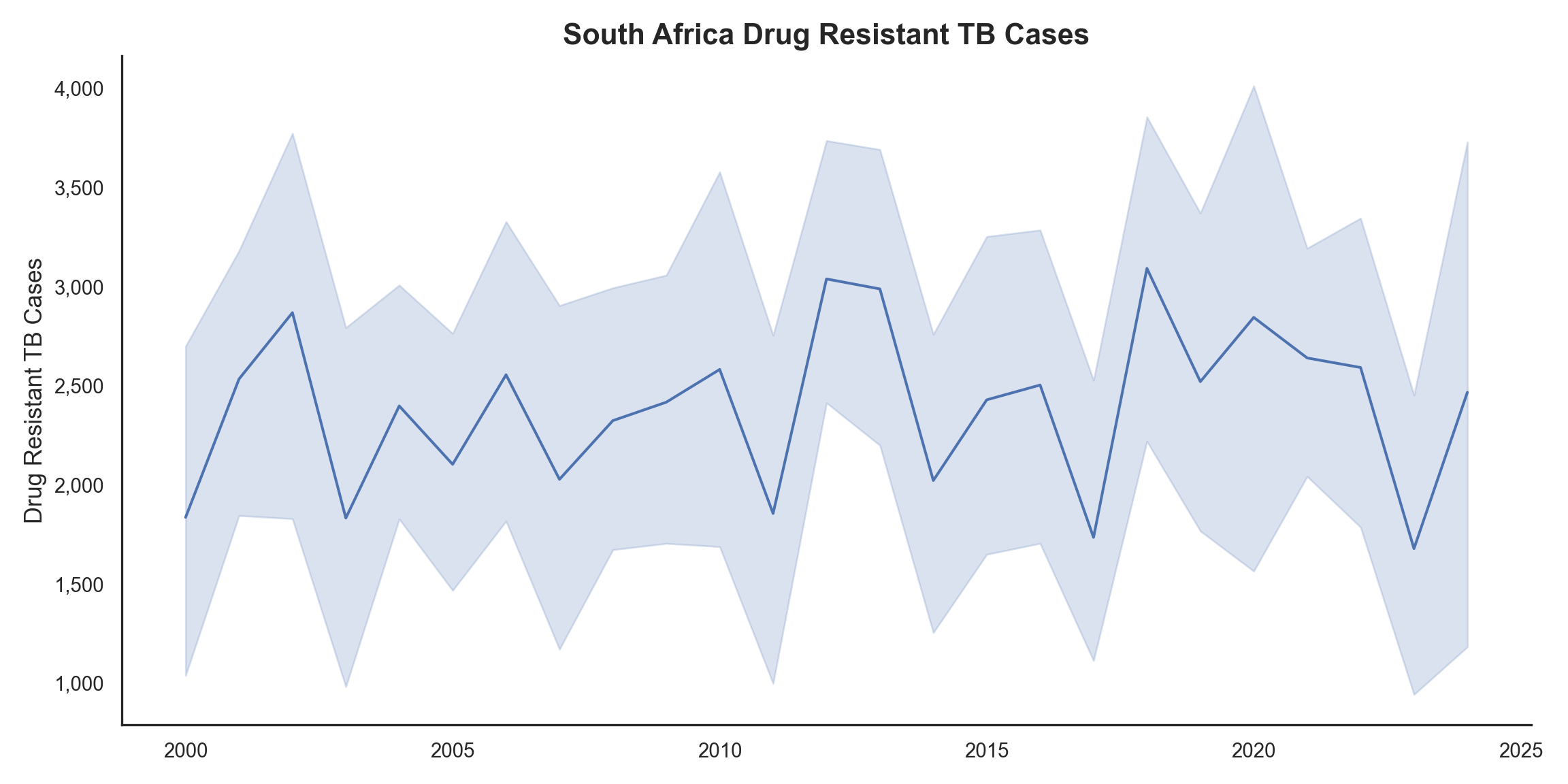 Figure 4 and Figure 5 highlights the persistent challenges of drug-resistant TB and HIV co-infection within South Africa. The trends for HIV co-infected cases show considerable variability, with peaks around 2005 and 2015, suggesting a need for targeted interventions.