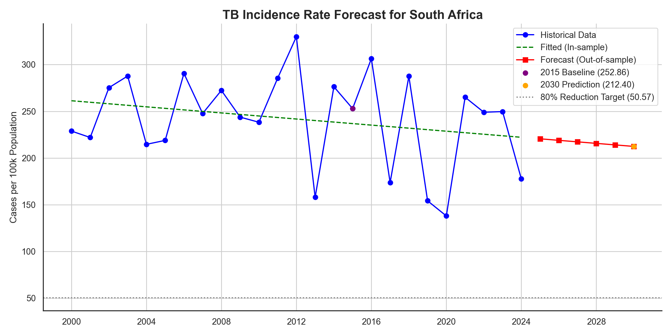This exploratory data analysis and predictive modeling project successfully identified key drivers of tuberculosis prevalence in South Africa and forecasted potential future trends. The analysis highlights that South Africa, under its current trajectory, is not projected to meet the ambitious 80% TB incidence reduction target by 2030.