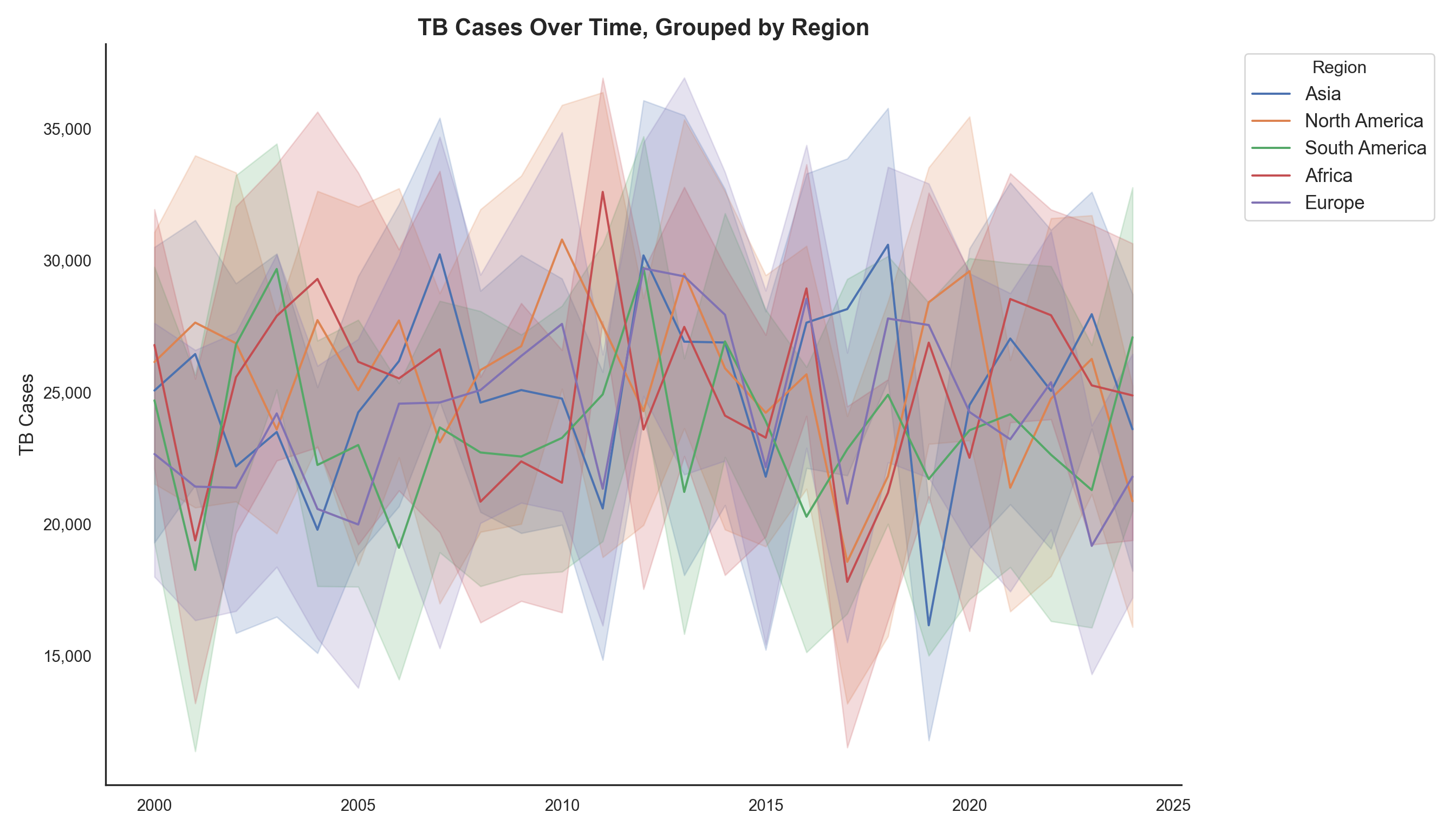This project conducts an exploratory data analysis (EDA) of the Tuberculosis_Trends.csv (Kyada, 2024) dataset available on Kaggle, which captures comprehensive country-level public health data from 2000 - 2024. The primary objective is to uncover patterns and relationships between TB indicators (cases, mortality, treatment success) and various socio-economic and health infrastructure metrics to identify key drivers of disease prevalence. Specifically, this analysis aims to answer: